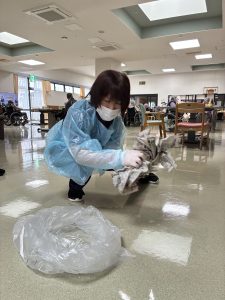 ※実際に嘔吐発生時を予測し手順に沿って研修を行いました。↓